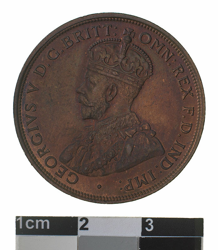 Obverse: GEORGIVS V D. G. BRITT: OMN: REX F. D. IND: IMP: Reverse: ONE PENNY COMMONWEALTH OF AUSTRALIA 1912 H