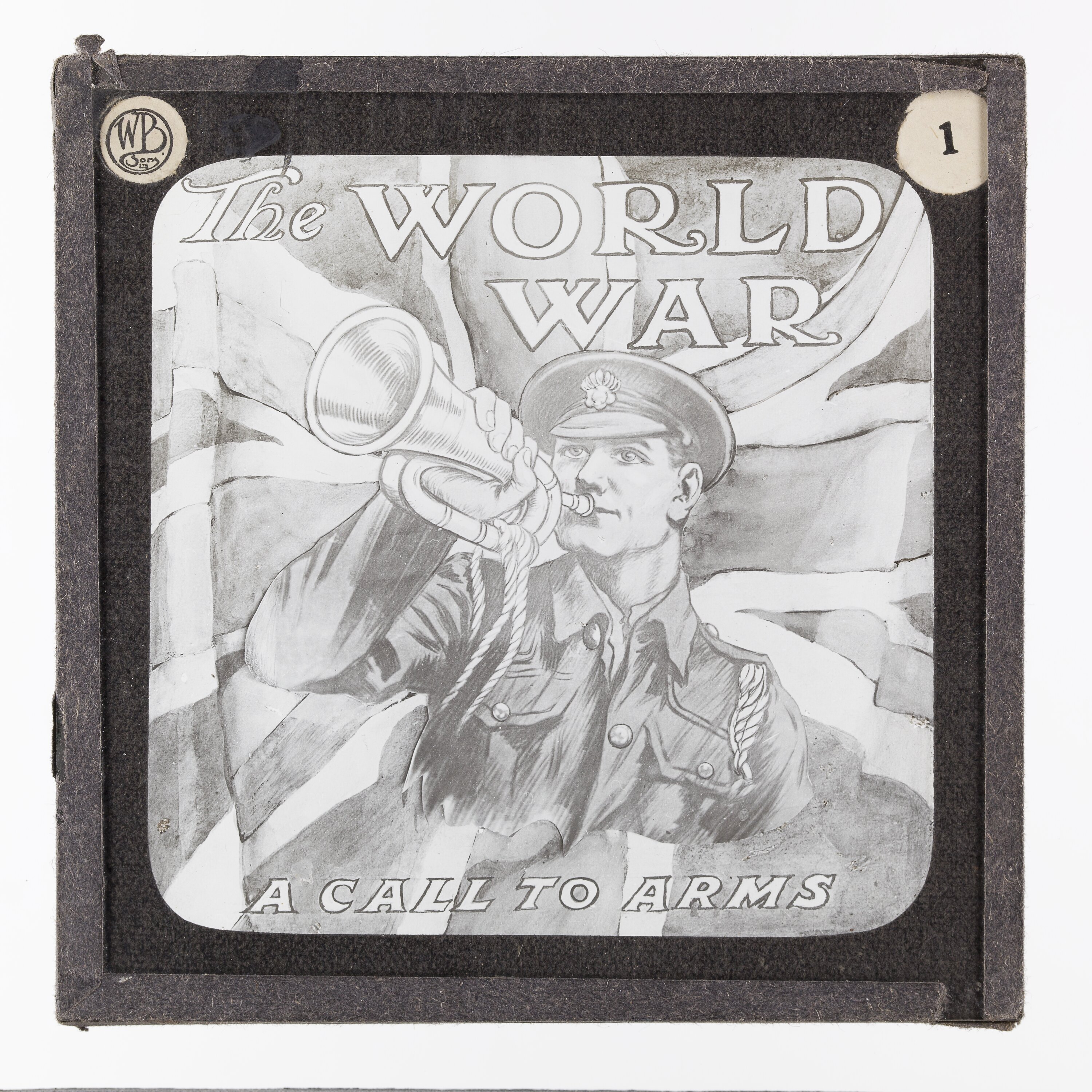 The image depicts a grayscale drawing of a soldier playing the bugle with the British National Flag in the background and the slogan 'The World War: A Call To Arms.'