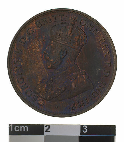 A proof bronze coin (30.8 mm diameter with plain edge) featuring a crowned and robed bust of George V facing left; around, GEORGIVS V D.G. BRITT: OMN: REX F.D. IND: IMP: ; below bust in small lettering the artist's initials B.M. The reverse features, within a circle of beads, the words ONE PENNY in two lines between upper and lower ornate scrolls; around the circle of beads, COMMONWEALTH OF AUSTRALIA . 1919 . There is a small dot below the lower scroll.