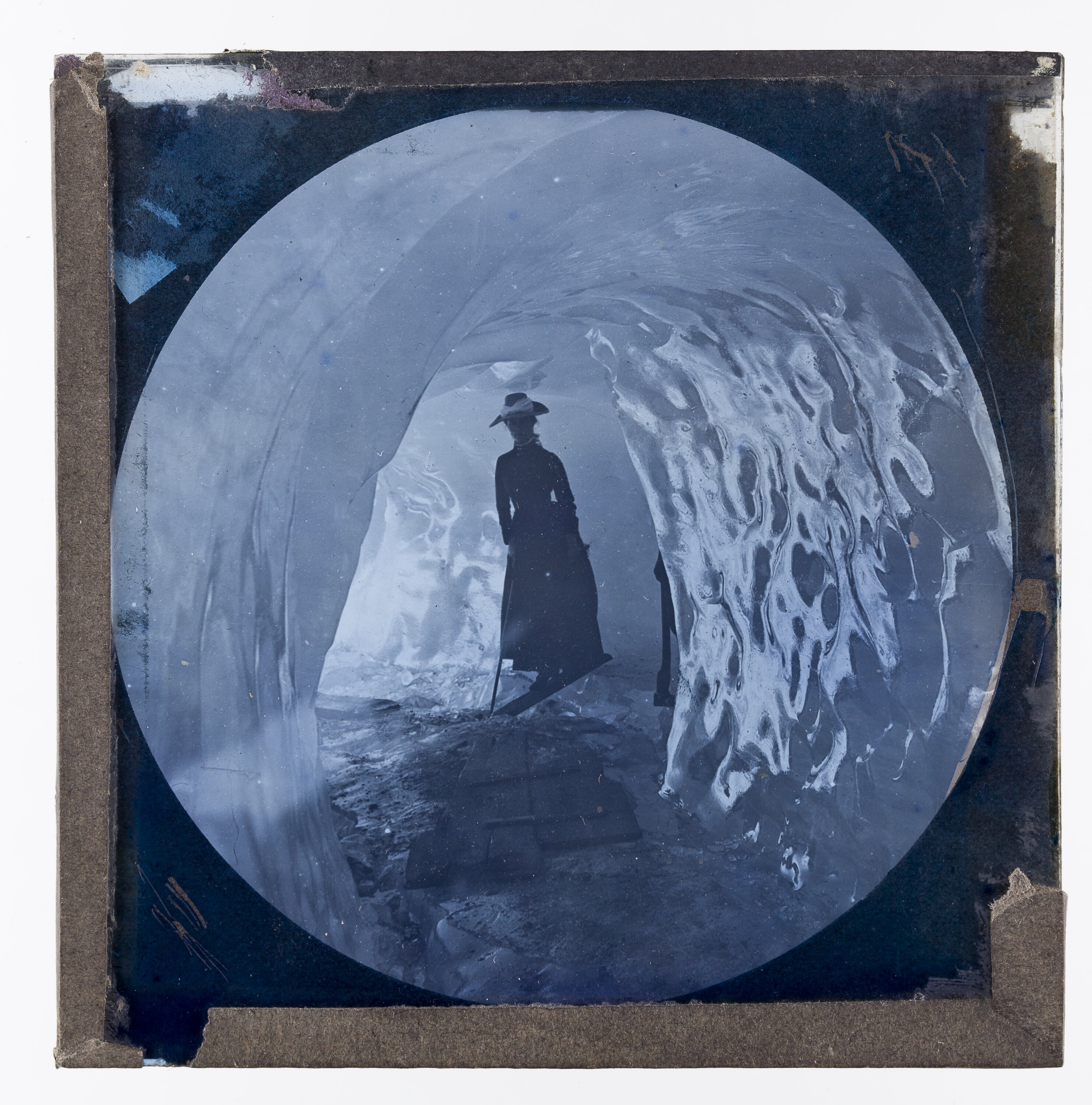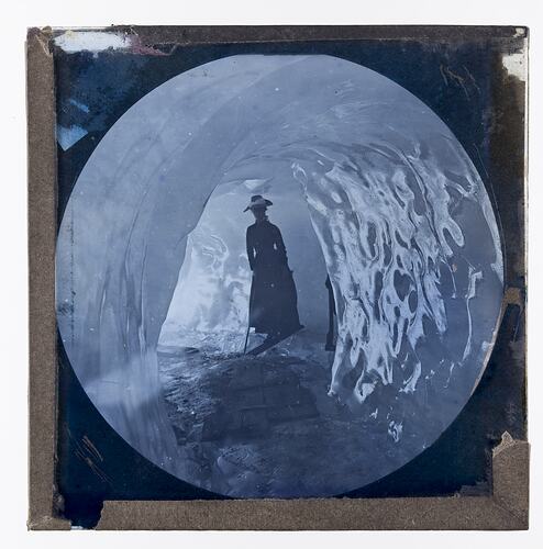 Lantern Slide of a woman crossing a small chasm in an ice cave. From around 1880 this format of photographic lantern slide came to dominate slide production.