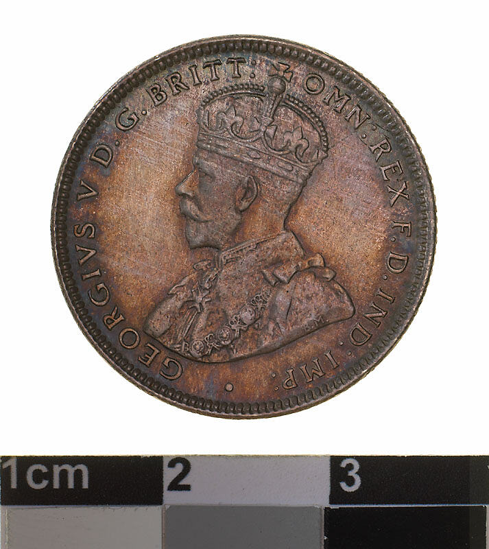 Obverse: GEORGIVS V D.G. BRITT: OMN: REX F.D. IND: IMP: Reverse: ONE SHILLING 1918 M ADVANCE AUSTRALIA