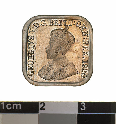 Between 1919 and 1921 a series of experiments were undertaken for a square coinage in nickel to replace the large bronze penny and halfpenny coins. The shape and size was based of a coin from Ceylon (Sri Lanka). These patterns were never authorised for issue.