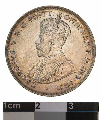 A silver coin (28 mm diameter with milled edge) featuring a crowned and robed bust of George V facing left; around, GEORGIVS V D. G. BRITT: OMN: REX F. D. IND: IMP: ; below bust in small lettering the artist's initials B.M. The reverse features the Ensigns Armorial of the Commonwealth of Australia, as authorised by Royal Warrent 7th May 1908 - composed of a simple shield enclosing a cross of Saint George on which are five six-pointed stars, around the outside of which are six small escutcheons, i.e., small shields. The shield is supported by a kangaroo and an emu standing on a grassy mound. Above the shield a crest, the seven-pointed star of Federation on a wreath. Below on a ribbon the motto ADVANCE AUSTRALIA was inscribed. Around above, ONE FLORIN - TWO SHILLINGS and below, between arrow heads, the date, 1920. Below the date is the mint mark M; above the date, a small star.