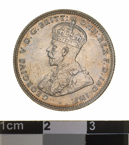 Obverse: GEORGIVS V D.G. BRITT: OMN: REX F.D. IND: IMP: Reverse: ONE SHILLING 1920 M ADVANCE AUSTRALIA