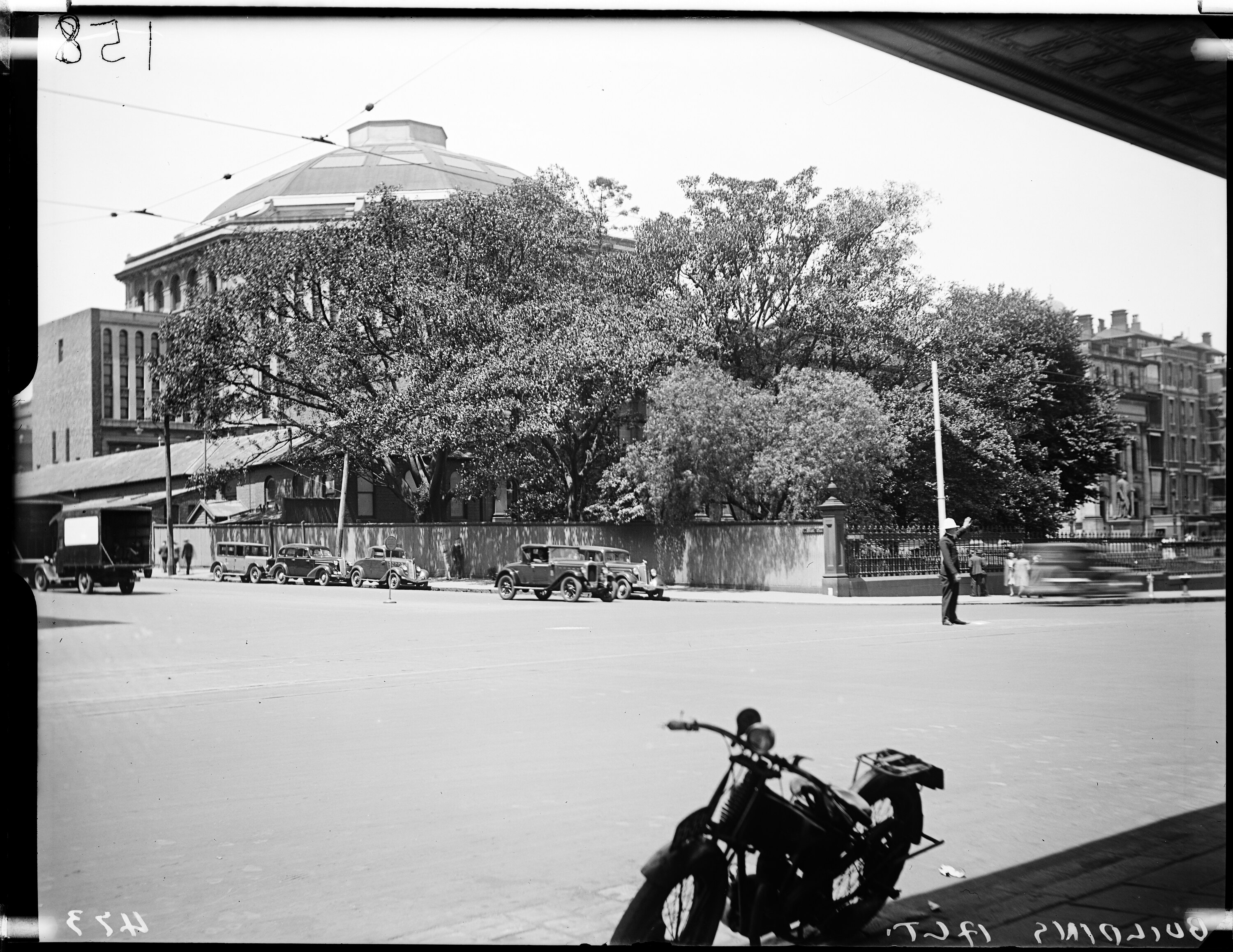 Negative copy of photograph showing the Industrial & Technological Museum (Science Museum) from the Russell Street entrance after completion of the Dome, circa 1920s.