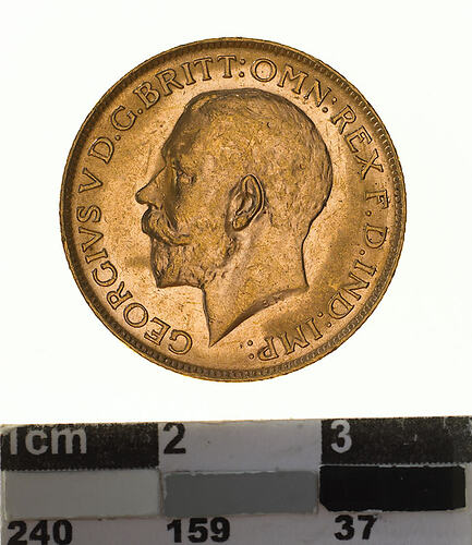 A circular gold coin (21.5 mm diameter with milled edge) featuring a bare head of George V facing left; below, the artist's initials B.M.; around, GEORGIVS V D.G. BRITT: OMN:REX F.D. IND:IMP: and on the reverse St. George on horseback holding short sword and wearing a helmet, cape and boots, the horse rearing over dragon whose side is pierced by a broken lance, the haft of the lance is on the ground behind the horse; the date, 1924 and artist's initials B.P. in exergue; the mint mark "P" in ground line above middle of date.