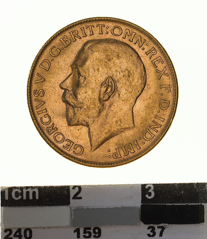 A circular gold coin (21.5 mm diameter with milled edge) featuring a bare head of George V facing left; below, the artist's initials B.M.; around, GEORGIVS V D.G. BRITT: OMN:REX F.D. IND:IMP: and on the reverse St. George on horseback holding short sword and wearing a helmet, cape and boots, the horse rearing over dragon whose side is pierced by a broken lance, the haft of the lance is on the ground behind the horse; the date, 1925 and artist's initials B.P. in exergue; the mint mark "P" in ground line above middle of date.
