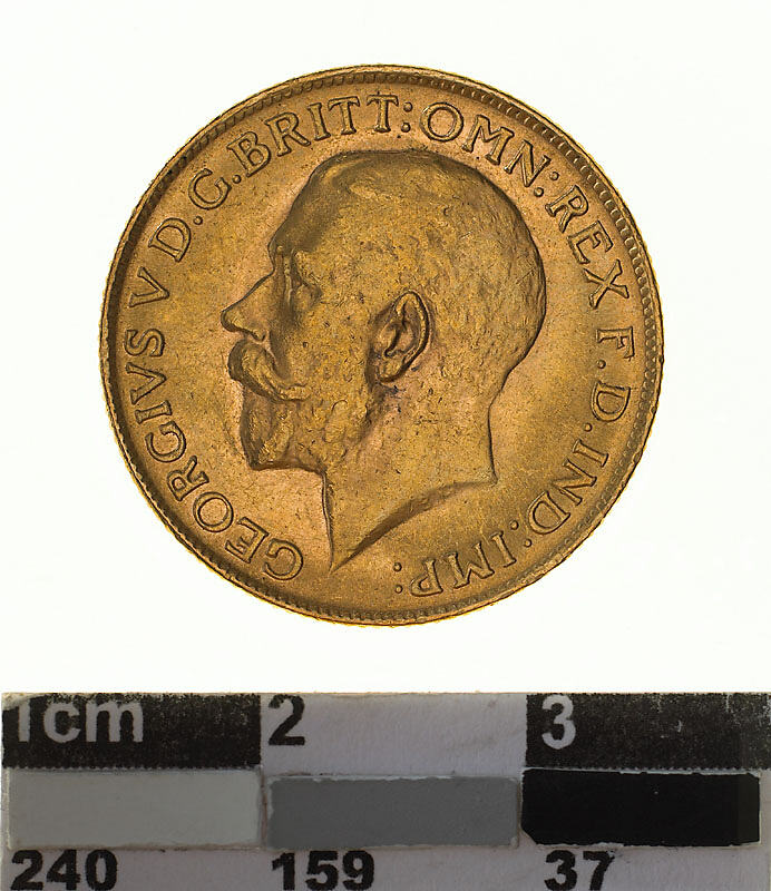 A circular gold coin (21.5 mm diameter with milled edge) featuring a bare head of George V facing left; below, the artist's initials B.M.; around, GEORGIVS V D.G. BRITT: OMN:REX F.D. IND:IMP: and on the reverse St. George on horseback holding short sword and wearing a helmet, cape and boots, the horse rearing over dragon whose side is pierced by a broken lance, the haft of the lance is on the ground behind the horse; the date, 1927 and artist's initials B.P. in exergue; the mint mark "P" in ground line above middle of date.