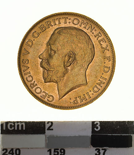 A circular gold coin (21.5 mm diameter with milled edge) featuring a bare head of George V facing left; below, the artist's initials B.M.; around, GEORGIVS V D.G. BRITT: OMN:REX F.D. IND:IMP: and on the reverse St. George on horseback holding short sword and wearing a helmet, cape and boots, the horse rearing over dragon whose side is pierced by a broken lance, the haft of the lance is on the ground behind the horse; the date, 1928 and artist's initials B.P. in exergue; the mint mark "P" in ground line above middle of date.