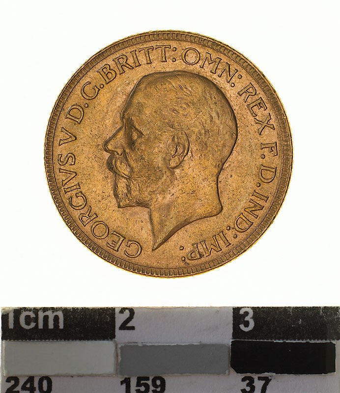 A circular gold coin (21.5 mm diameter with milled edge) featuring a "small" bare head of George V facing left; below, the artist's initials B.M.; around, GEORGIVS V D.G. BRITT: OMN:REX F.D. IND:IMP: and on the reverse St. George on horseback holding short sword and wearing a helmet, cape and boots, the horse rearing over dragon whose side is pierced by a broken lance, the haft of the lance is on the ground behind the horse; the date, 1929 and artist's initials B.P. in exergue; the mint mark "P" in ground line above middle of date.