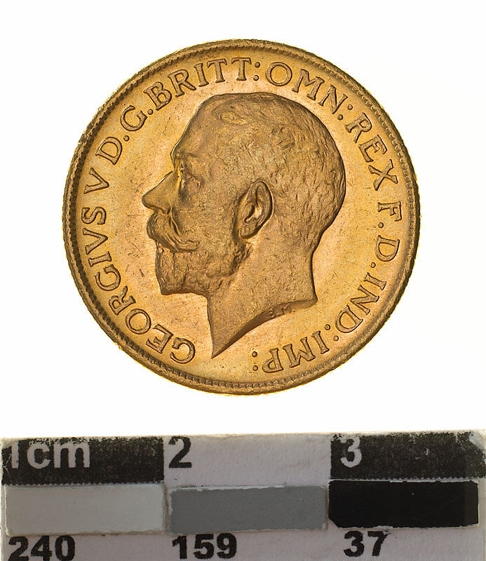A circular gold coin (21.5 mm diameter with milled edge) featuring a bare head of George V facing left; below, the artist's initials B.M.; around, GEORGIVS V D.G. BRITT: OMN:REX F.D. IND:IMP: and on the reverse St. George on horseback holding short sword and wearing a helmet, cape and boots, the horse rearing over dragon whose side is pierced by a broken lance, the haft of the lance is on the ground behind the horse; the date, 1912 and artist's initials B.P. in exergue; the mint mark "M" in ground line above middle of date.