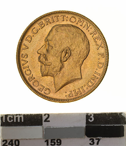 A circular gold coin (22 mm diameter with milled edge) featuring a bare head of George V facing left; below, the artist's initials B.M.; around, GEORGIVS V D.G. BRITT: OMN:REX F.D. IND:IMP: and on the reverse St. George on horseback holding short sword and wearing a helmet, cape and boots, the horse rearing over dragon whose side is pierced by a broken lance, the haft of the lance is on the ground behind the horse; the date, 1913 and artist's initials B.P. in exergue; the mint mark "M" in ground line above middle of date.