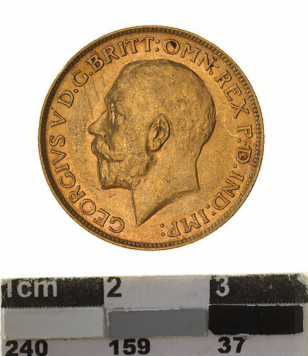 A circular gold coin (22 mm diameter with milled edge) featuring a bare head of George V facing left; below, the artist's initials B.M.; around, GEORGIVS V D.G. BRITT: OMN:REX F.D. IND:IMP: and on the reverse St. George on horseback holding short sword and wearing a helmet, cape and boots, the horse rearing over dragon whose side is pierced by a broken lance, the haft of the lance is on the ground behind the horse; the date, 1914 and artist's initials B.P. in exergue; the mint mark "P" in ground line above middle of date.