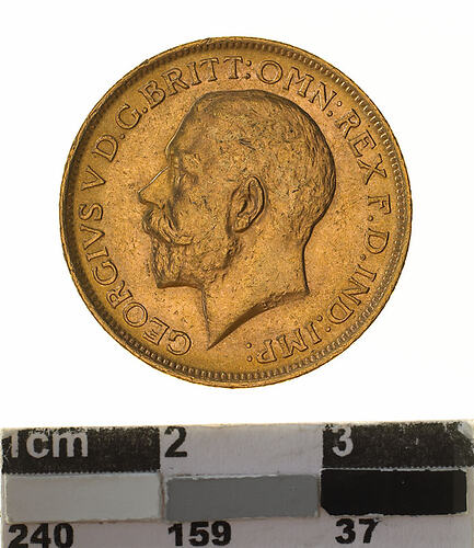 A circular gold coin (22 mm diameter with milled edge) featuring a bare head of George V facing left; below, the artist's initials B.M.; around, GEORGIVS V D.G. BRITT: OMN:REX F.D. IND:IMP: and on the reverse St. George on horseback holding short sword and wearing a helmet, cape and boots, the horse rearing over dragon whose side is pierced by a broken lance, the haft of the lance is on the ground behind the horse; the date, 1914 and artist's initials B.P. in exergue; the mint mark "S" in ground line above middle of date.