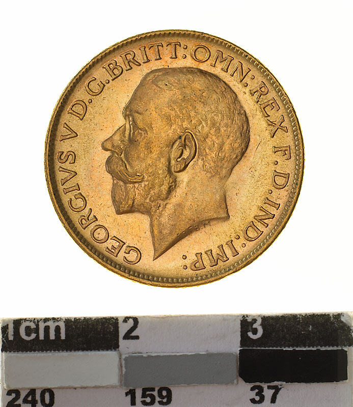 A circular gold coin (22 mm diameter with milled edge) featuring a bare head of George V facing left; below, the artist's initials B.M.; around, GEORGIVS V D.G. BRITT: OMN:REX F.D. IND:IMP: and on the reverse St. George on horseback holding short sword and wearing a helmet, cape and boots, the horse rearing over dragon whose side is pierced by a broken lance, the haft of the lance is on the ground behind the horse; the date, 1914 and artist's initials B.P. in exergue; the mint mark "M" in ground line above middle of date.