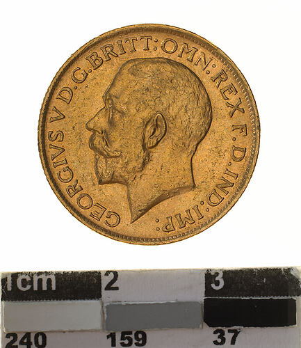 A circular gold coin (22 mm diameter with milled edge) featuring a bare head of George V facing left; below, the artist's initials B.M.; around, GEORGIVS V D.G. BRITT: OMN:REX F.D. IND:IMP: and on the reverse St. George on horseback holding short sword and wearing a helmet, cape and boots, the horse rearing over dragon whose side is pierced by a broken lance, the haft of the lance is on the ground behind the horse; the date, 1917 and artist's initials B.P. in exergue; the mint mark "S" in ground line above middle of date.