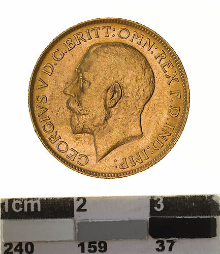 A circular gold coin (22 mm diameter with milled edge) featuring a bare head of George V facing left; below, the artist's initials B.M.; around, GEORGIVS V D.G. BRITT: OMN:REX F.D. IND:IMP: and on the reverse St. George on horseback holding short sword and wearing a helmet, cape and boots, the horse rearing over dragon whose side is pierced by a broken lance, the haft of the lance is on the ground behind the horse; the date, 1917 and artist's initials B.P. in exergue; the mint mark "P" in ground line above middle of date.
