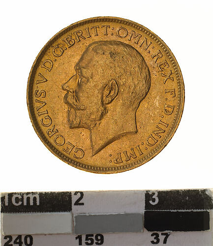 A circular gold coin (22 mm diameter with milled edge) featuring a bare head of George V facing left; below, the artist's initials B.M.; around, GEORGIVS V D.G. BRITT: OMN:REX F.D. IND:IMP: and on the reverse St. George on horseback holding short sword and wearing a helmet, cape and boots, the horse rearing over dragon whose side is pierced by a broken lance, the haft of the lance is on the ground behind the horse; the date, 1918 and artist's initials B.P. in exergue; the mint mark "S" in ground line above middle of date.