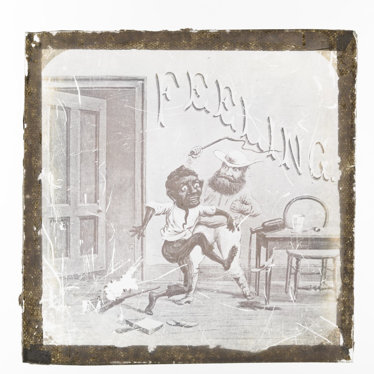 Image depicting a bearded white man whipping a coarse stereotype of a First Peoples man in a deeply racist portrayal with the word 'Feeling' above the action. Some cleaning implements suggests the man is a domestic servant, possibly distracted by a bottle of alcohol, playing into racist tropes about First Peoples and drunkedness, as well a their role as servants to white people. It is one of a series of early 20th century narrative lantern slides.