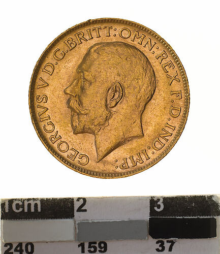 A circular gold coin (22 mm diameter with milled edge) featuring a bare head of George V facing left; below, the artist's initials B.M.; around, GEORGIVS V D.G. BRITT: OMN:REX F.D. IND:IMP: and on the reverse St. George on horseback holding short sword and wearing a helmet, cape and boots, the horse rearing over dragon whose side is pierced by a broken lance, the haft of the lance is on the ground behind the horse; the date, 1923 and artist's initials B.P. in exergue; the mint mark "P" in ground line above middle of date.