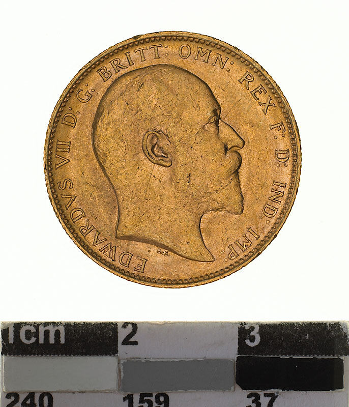 A circular gold coin (22 mm diameter with milled edge) featuring a bare head of Edward VII facing right; below, the artist's initials DeS; around, EDWARDVS VII D:G: BRITT: OMN:REX F:D: IND:IMP: and on the reverse St. George on horseback holding short sword and wearing a helmet, cape and boots, the horse rearing over dragon whose side is pearced by a broken lance, the haft of the lance is on the ground behind the horse; the date, 1908 and artist's initials B.P. in exergue; the mint mark "P" in ground line above middle of date.