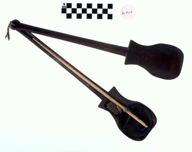 Ivory rod with tapered ends and black measurement markings along length. A separate oblong brass weight with central whole through which a knotted string is threaded allows the weight to be hung from one end of the rod whilst a shallow metal dish with four holes that are each threaded with blue string is affixed and hangs from the other end of the ivory rod. Wooden case has two parts (base and lid) that feature a long thin section to house the ivory rod and a bulbous section at one end where the brass weight and dish can also be stored. The case and lid are connected at the end of the thinner section by a threaded string.
