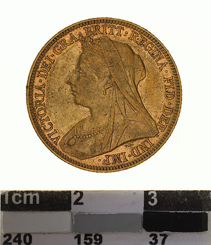 A gold coin (21.5 mm diameter with milled edge) featuring a crowned bust of Queen Victoria facing left, veiled and draped, wearing ribbon and Star of Garter; around VICTORIA . DEI . GRA . BRITT. REGINA . FID . DEF . IND . IMP . , the artist's initials, T.B. are below the bust. The reverse features St. George on horseback holding short sword in right hand, wearing a flowing cape, helmet and boots; the horse rearing to right over a fallen dragon which has a broken lance in its chest; the date, 1897 in the exergue. The mint mark M is in the ground above the middle of the date.