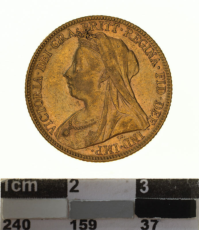 A gold coin (21.5 mm diameter with milled edge) featuring a crowned bust of Queen Victoria facing left, veiled and draped, wearing ribbon and Star of Garter; around VICTORIA . DEI . GRA . BRITT. REGINA . FID . DEF . IND . IMP . , the artist's initials, T.B. are below the bust. The reverse features St. George on horseback holding short sword in right hand, wearing a flowing cape, helmet and boots; the horse rearing to right over a fallen dragon which has a broken lance in its chest; the date, 1898 in the exergue. The mint mark M is in the ground above the middle of the date.
