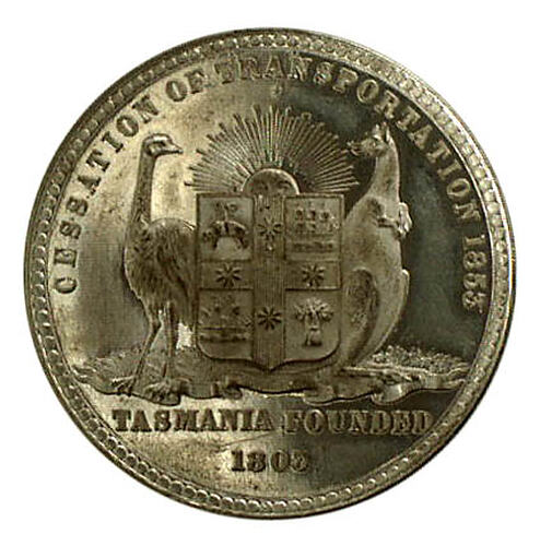 Australian Arms with emu and kangaroo supporters; around, CESSATION OF TRANSPORTATION 1853; in exergue, TASMANIA FOUNDED 1803