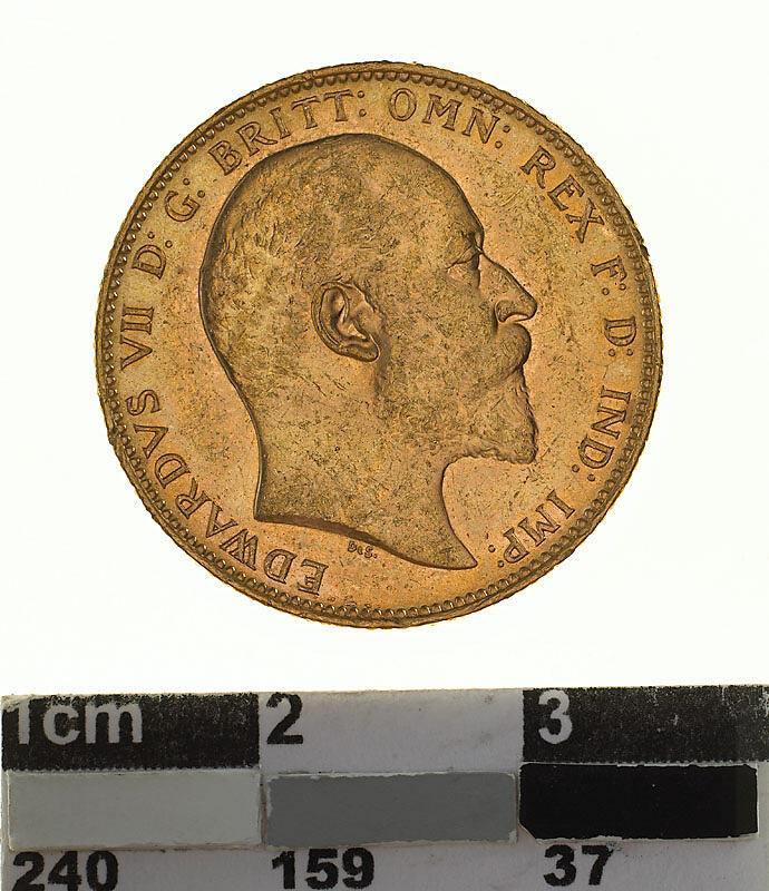 A circular gold coin (22 mm diameter with milled edge) featuring a bare head of Edward VII facing right; below, the artist's initials DeS; around, EDWARDVS VII D:G: BRITT: OMN:REX F:D: IND:IMP: and on the reverse St. George on horseback holding short sword and wearing a helmet, cape and boots, the horse rearing over dragon whose side is pearced by a broken lance, the haft of the lance is on the ground behind the horse; the date, 1903 and artist's initials B.P. in exergue; the mint mark "M" in ground line above middle of date.
