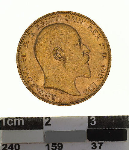 A circular gold coin (22 mm diameter with milled edge) featuring a bare head of Edward VII facing right; below, the artist's initials DeS; around, EDWARDVS VII D:G: BRITT: OMN:REX F:D: IND:IMP: and on the reverse St. George on horseback holding short sword and wearing a helmet, cape and boots, the horse rearing over dragon whose side is pearced by a broken lance, the haft of the lance is on the ground behind the horse; the date, 1904 and artist's initials B.P. in exergue; the mint mark "P" in ground line above middle of date.