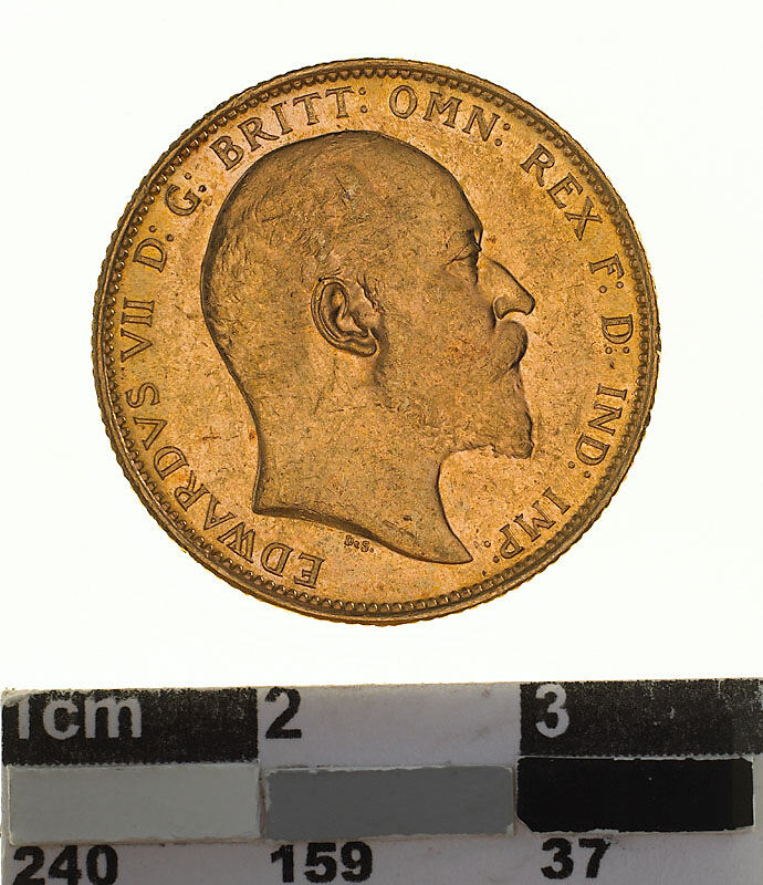 A circular gold coin (22 mm diameter with milled edge) featuring a bare head of Edward VII facing right; below, the artist's initials DeS; around, EDWARDVS VII D:G: BRITT: OMN:REX F:D: IND:IMP: and on the reverse St. George on horseback holding short sword and wearing a helmet, cape and boots, the horse rearing over dragon whose side is pearced by a broken lance, the haft of the lance is on the ground behind the horse; the date, 1907 and artist's initials B.P. in exergue; the mint mark "M" in ground line above middle of date.