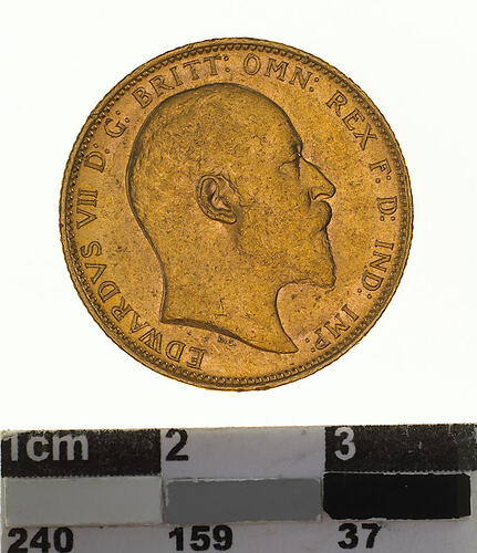 A circular gold coin (22 mm diameter with milled edge) featuring a bare head of Edward VII facing right; below, the artist's initials DeS; around, EDWARDVS VII D:G: BRITT: OMN:REX F:D: IND:IMP: and on the reverse St. George on horseback holding short sword and wearing a helmet, cape and boots, the horse rearing over dragon whose side is pearced by a broken lance, the haft of the lance is on the ground behind the horse; the date, 1908 and artist's initials B.P. in exergue; the mint mark "M" in ground line above middle of date.