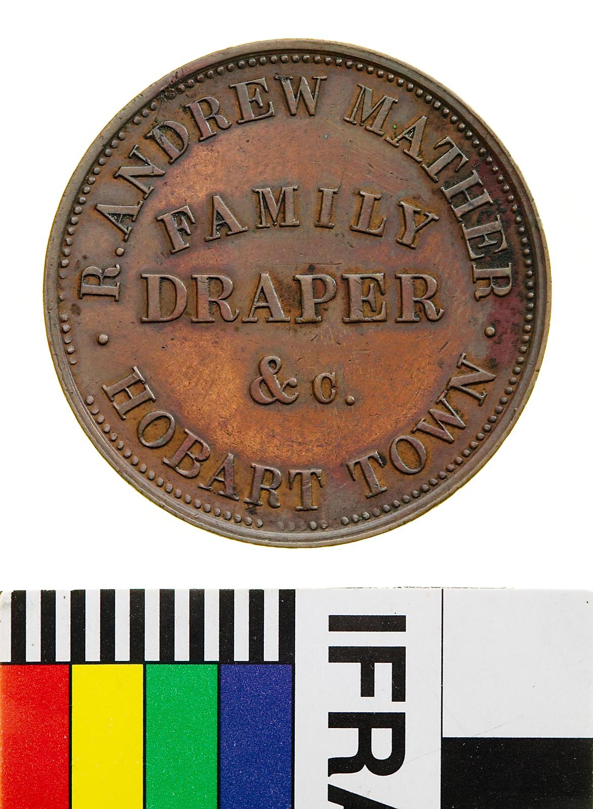 Copper One Penny Token, minted by Heaton & Sons, Birmingham, circa 1855-1860. Issued by R. Andrew Mather, Family Draper, Hobart, Tasmania. This firm was established in 1823 by Robert Andrew Mather Snr, who had arrived in Hobart with his wife Ann in 1822. Robert Andrew Mather Jnr was born and educated in Tasmania and managed the business from the late 1840s until his retirement in 1876, when his sons Robert and Thomas took control, changing the name of the store to Andrew Mather and Co.. Thomas retired from the business in 1894, and Robert was still managing the store in 1910, assisted by his two sons.