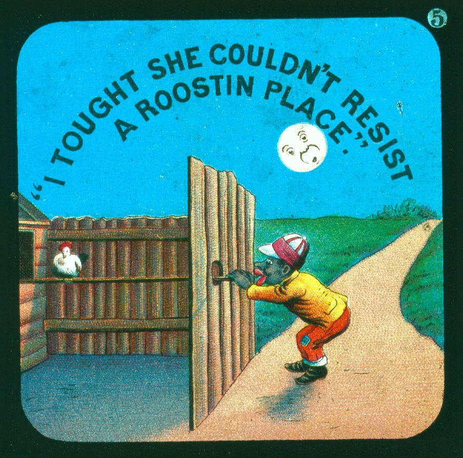 Text on slide: "I TOUGHT SHE COULDN'T RESIST/A ROOSTIN PLACE." Printed upper right hand corner: 5