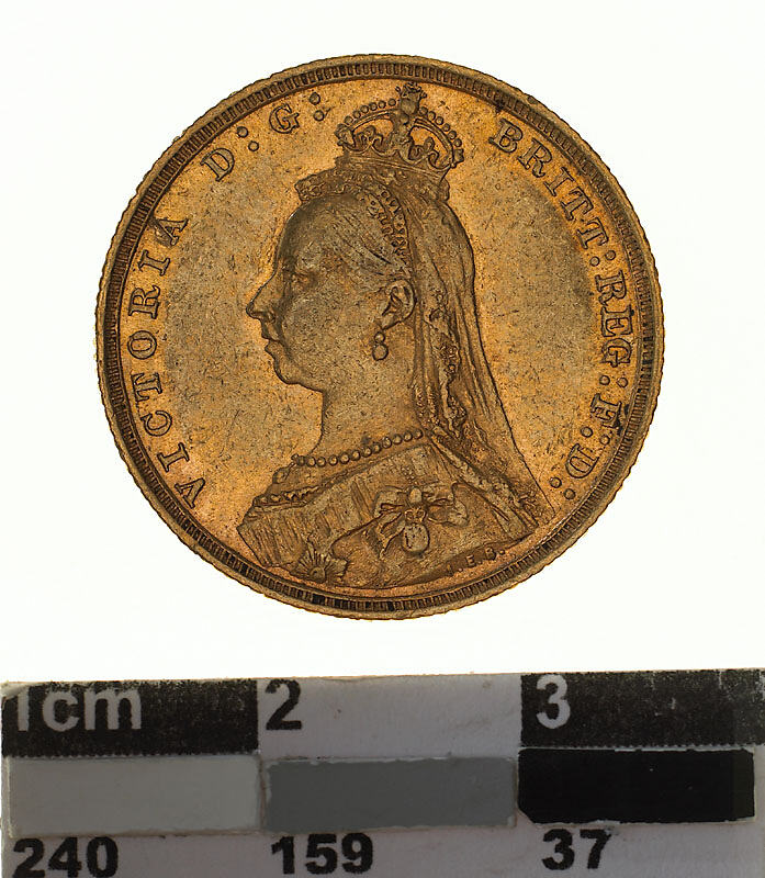 A gold coin (21.5 mm diameter with milled edge) featuring the Jubilee bust of Queen Victoria wearing imperial crown and facing left, a long veil falls behind the head, the bust is draped and decorated with the Star of the Garter, and also the badge of the Imperial Order of the Crown of India; around, VICTORIA D:G: BRITT: REG: F:D: , the artist's initials J.E.B. below the shoulder.The reverse features St. George on horseback holding a short sword in his right hand, the horse rearing to right over a fallen dragon which has a broken lance in its chest; in exergue, the date, 1892 and the artist's initials B.P.; the mint mark, S, is in the ground above the middle of the date.