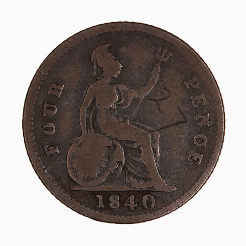 Britannia seated facing right holds trident and rests right hand on shield; around, FOUR PENCE; in exergue, 1840