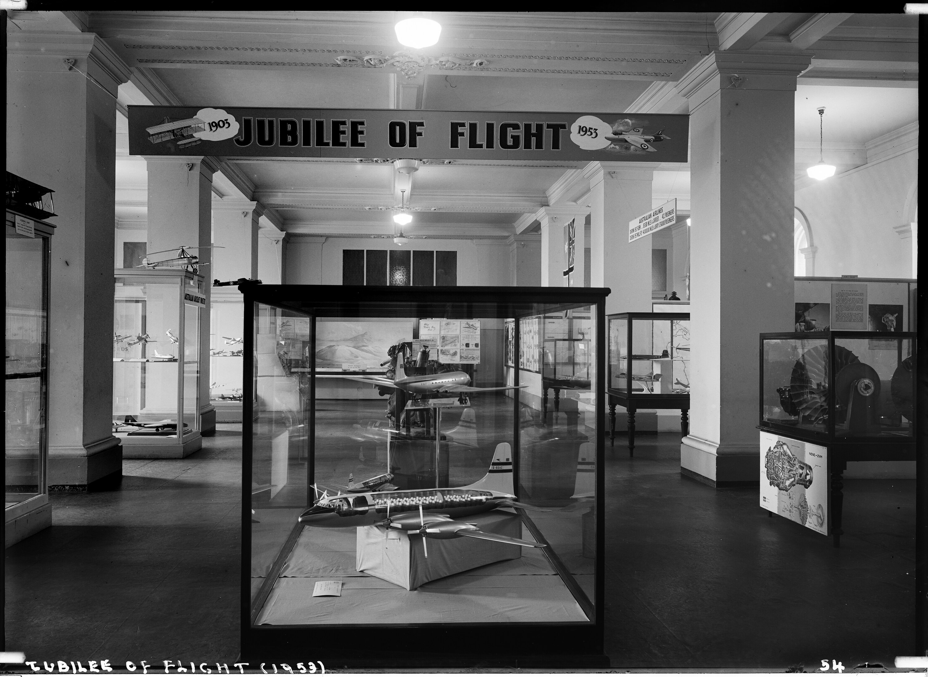 Photograph of Palmer Hall displays for the Jubilee of Flight Exhibition. The exhibition commemorated fifty years of aviation and was open to the public from Dec 10 1953 to Feb 1954.