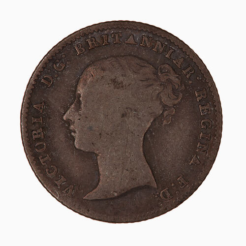 Head of the Queen facing left, ribbon in hair; around, VICTORIA D: G: BRITANNIAR: REGINA F: D: