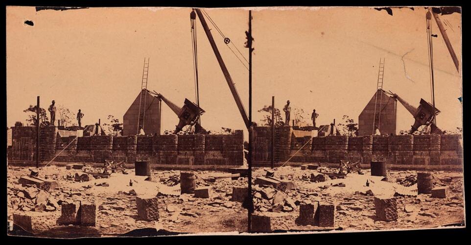 Stereograph of the Great Melbourne Telescope being erected at the Melbourne Observatory, 1869.