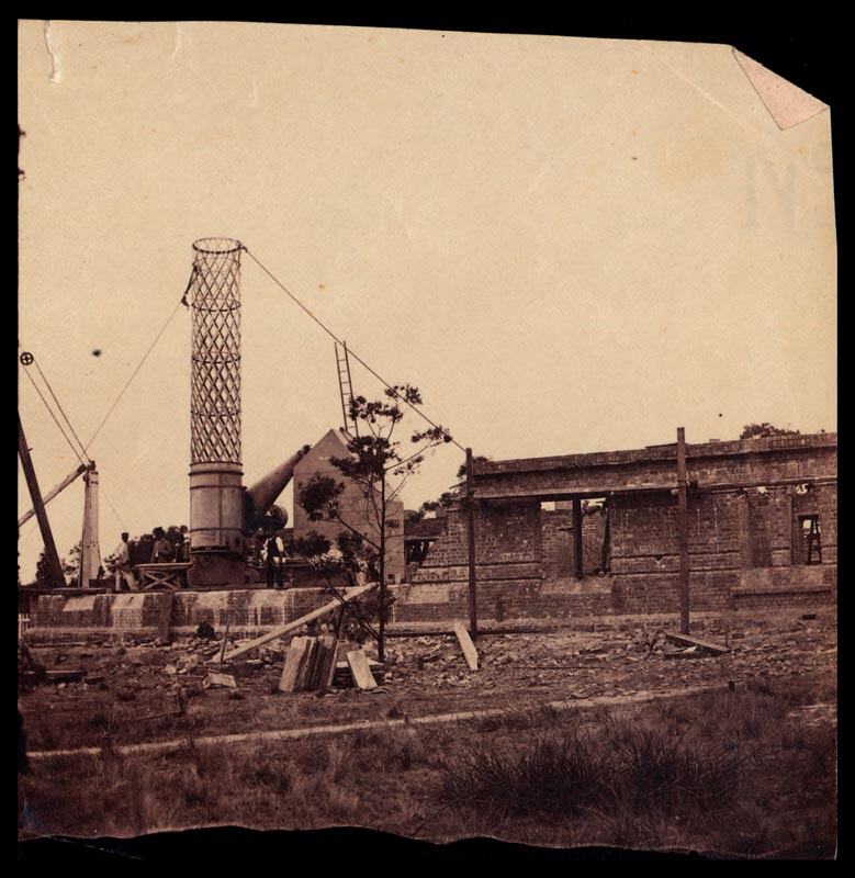 The Great Melbourne Telescope being erected at the Melbourne Observatory, 1869. The main tube of the telescope has been placed in position on the masonry foundations. Workmen on the project are standing alongside the telescope. In the foreground there are building materials and equipment, including blocks of masonry and a Derrick crane [at left].