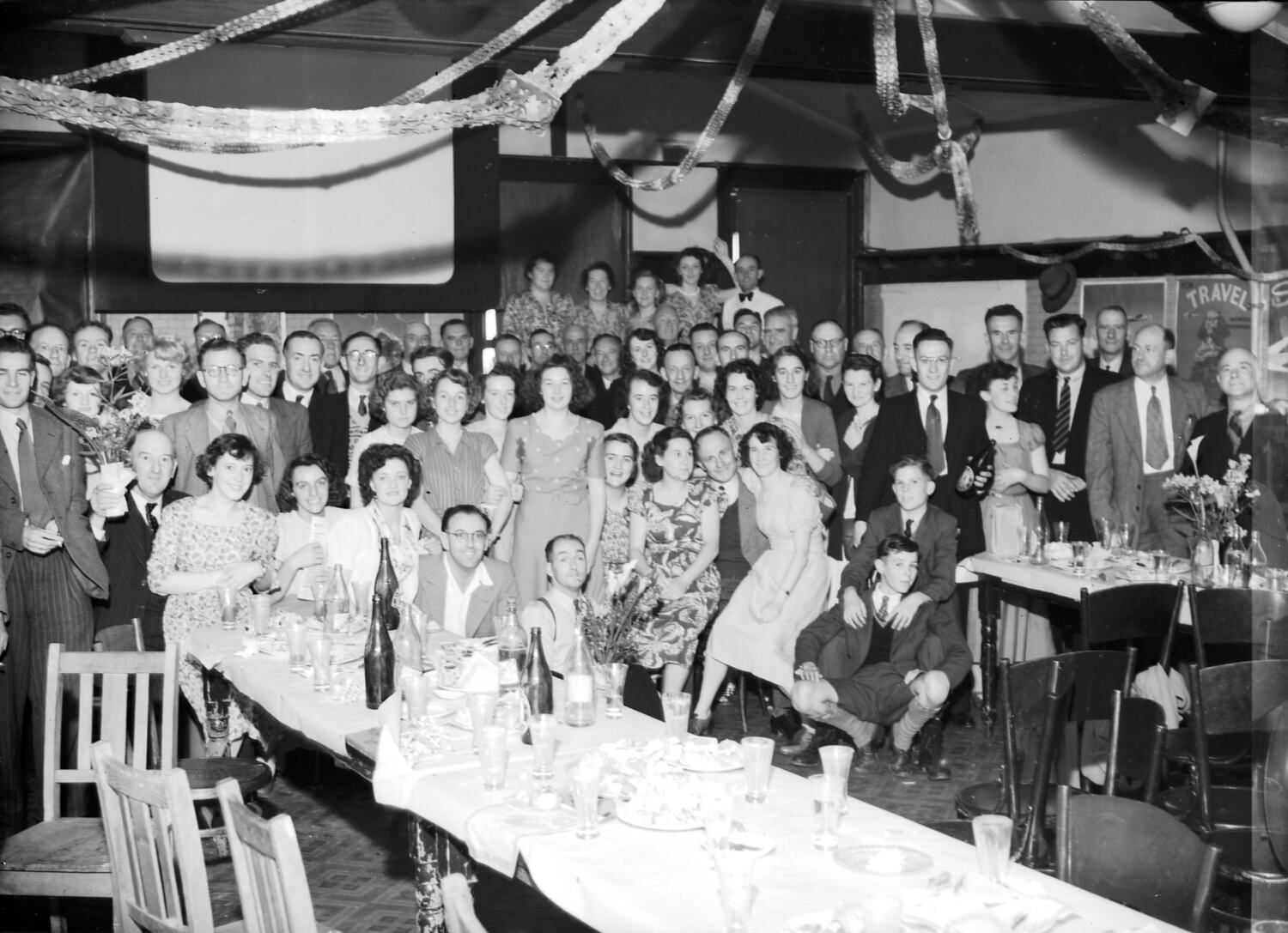 Negative of an image showing a Christmas party organised by the H.V McKay Massey Harris Cost Office in 1949.