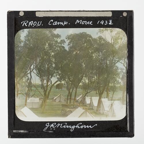Coloured lantern slide depicting a RAOU (Royal Australian Ornithologists Union) Camp site at Moree, 1933.