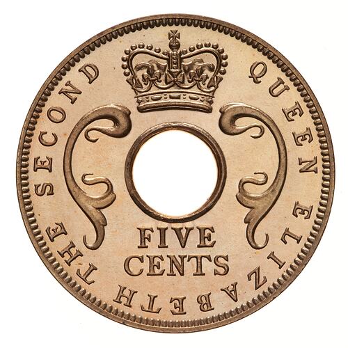 A central hole with curved floral design to left and right; above hole, crown; below hole in two lines, FIVE / CENTS; around, QUEEN ELIZABETH THE SECOND