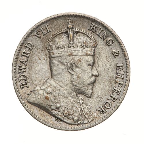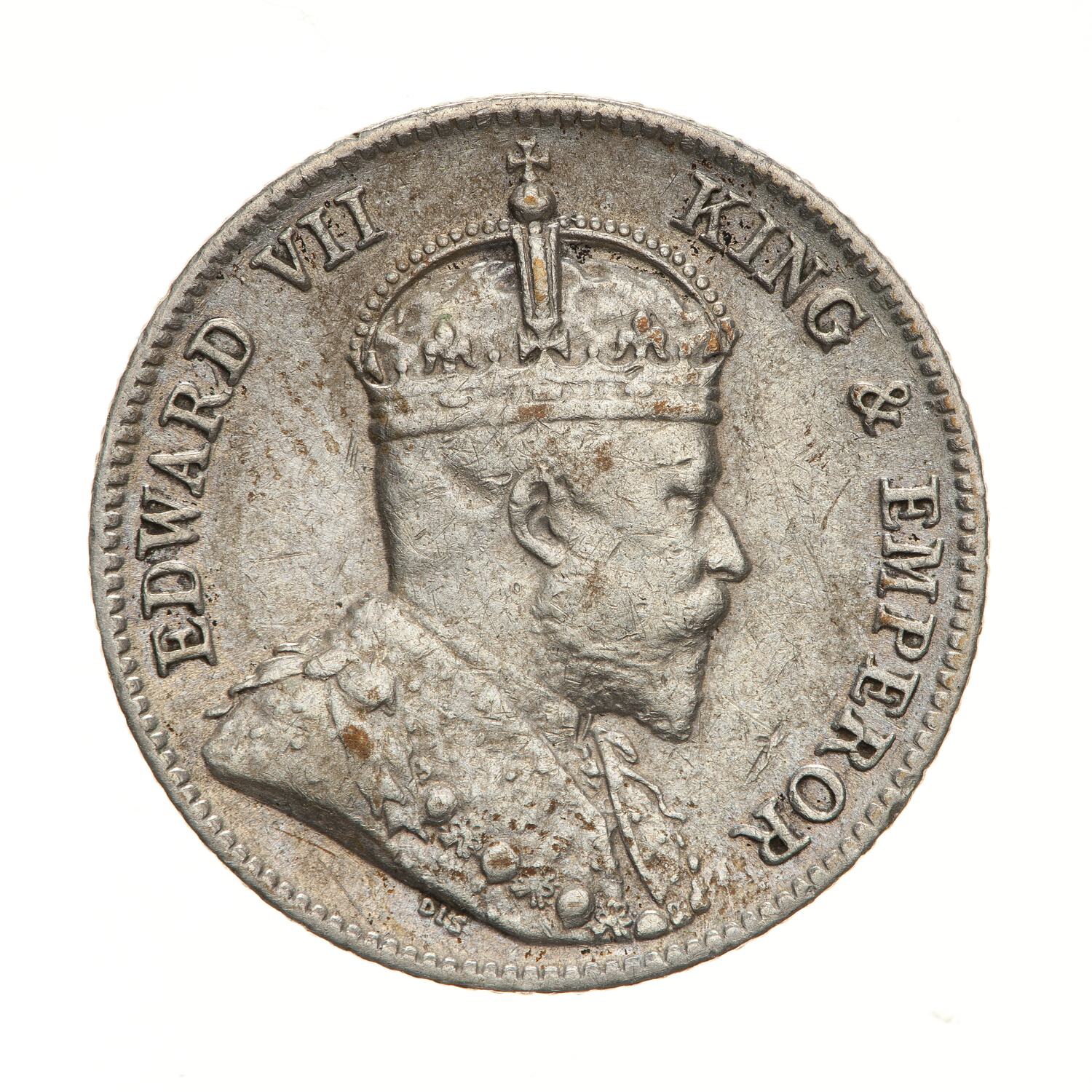 Crowned and draped bust of the King facing right, the King is wearing the Imperial Crown and the ermine Robe of State, the Collar of the Most Honourable Order of the Bath; around, EDWARD VII KING & EMPEROR; below the bust truncation, the artist's initials, DES