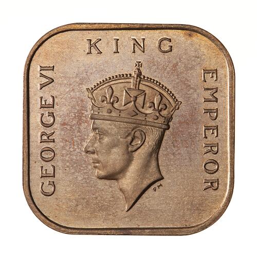 Crowned head of the King facing left; around, GEORGE VI KING EMPEROR; artist's initials, PM, below neck