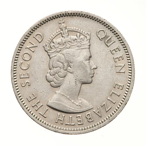 Crowned bust of the Queen facing right; around, QUEEN ELIZABETH THE SECOND