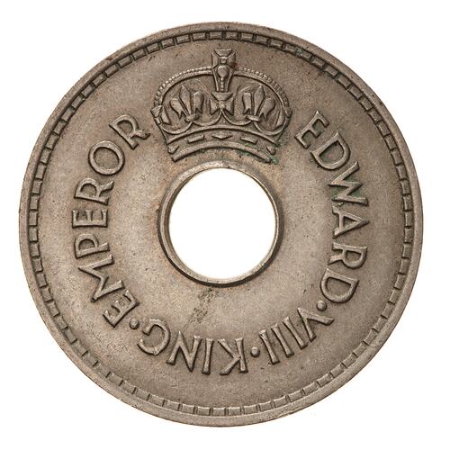 Above central hole, a crown; around hole, EDWARD VIII KING EMPEROR