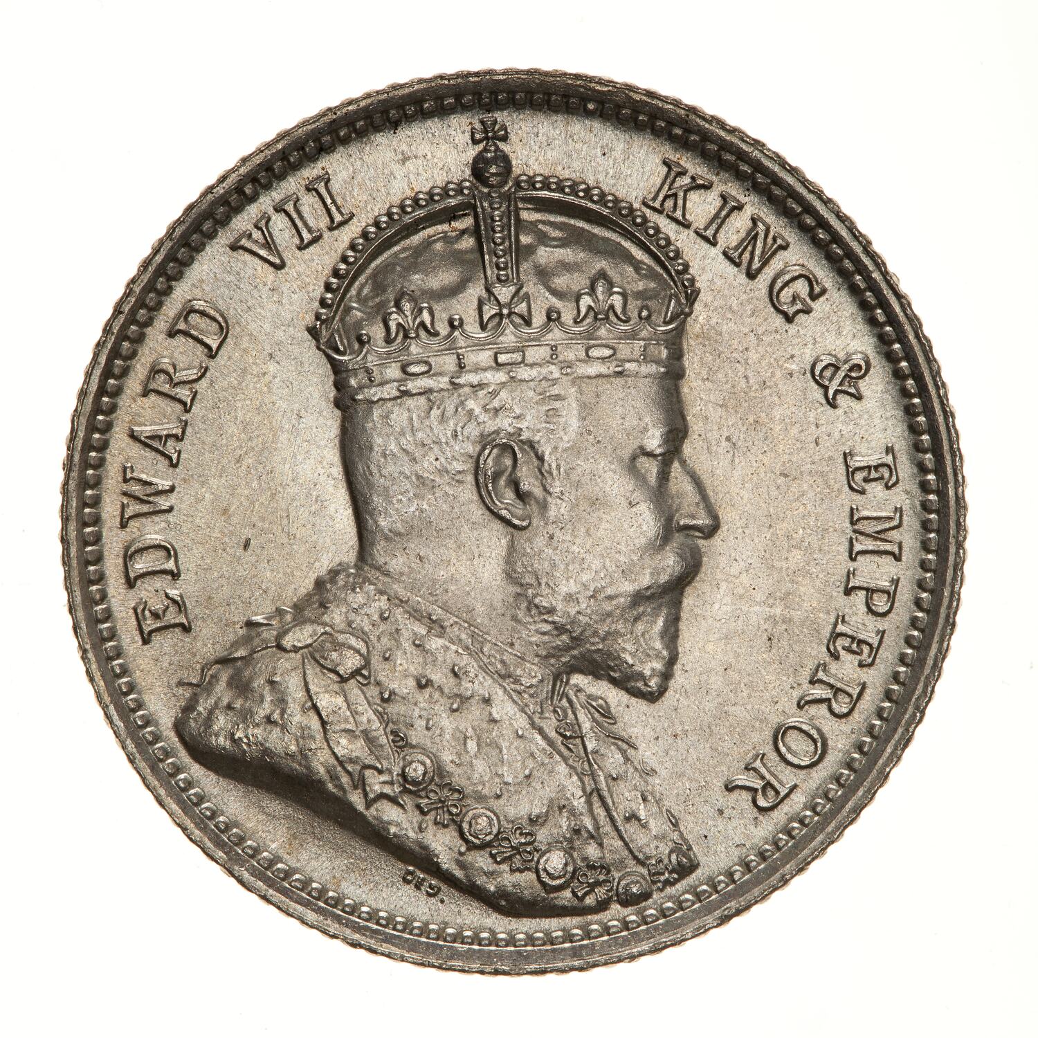 Bust of the King facing right wearing the Imperial crown and robe of State with the collar of the Garter and the badge of the Bath; around, EDWARD VII KING & EMPEROR; below the bust, the artist's initials, DES