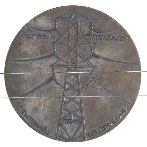 This is the official Melbourne and Victorian Centenary medal of 1934. It was struck in silver and bronze to help fund the events surrounding the Centenary celebrations (this example is bronze). The designer was the noted artist Rayner Hoff, but the features of a sheep's skull and high voltage power lines proved unpopular. The dies used to strike the medal were defaced and placed in Museum Victoria's collection to ensure that no extra medals could be struck. The original dies are held by the Museum.